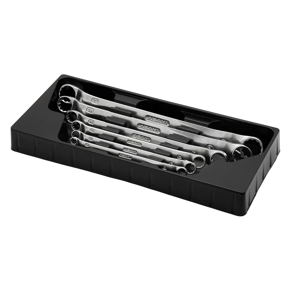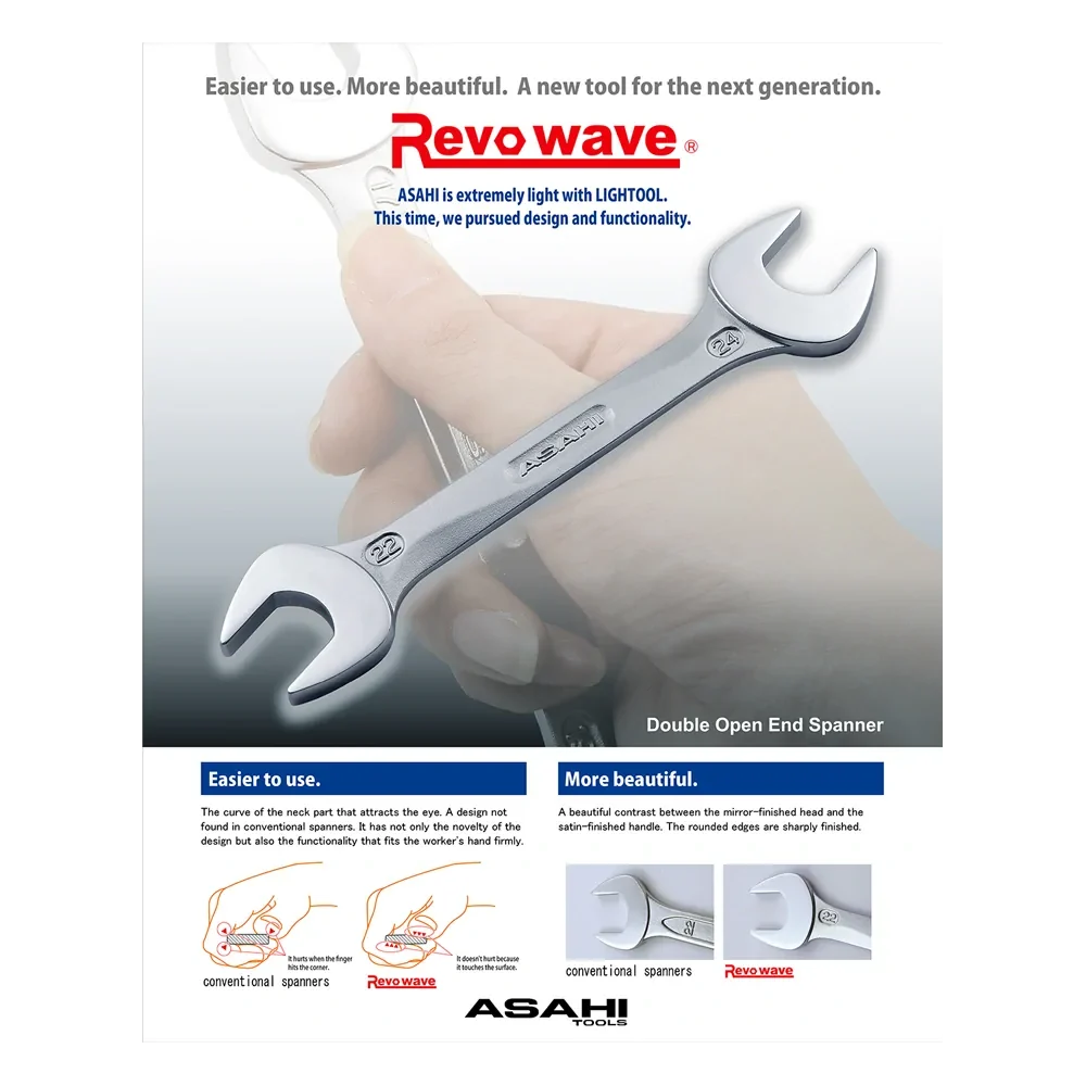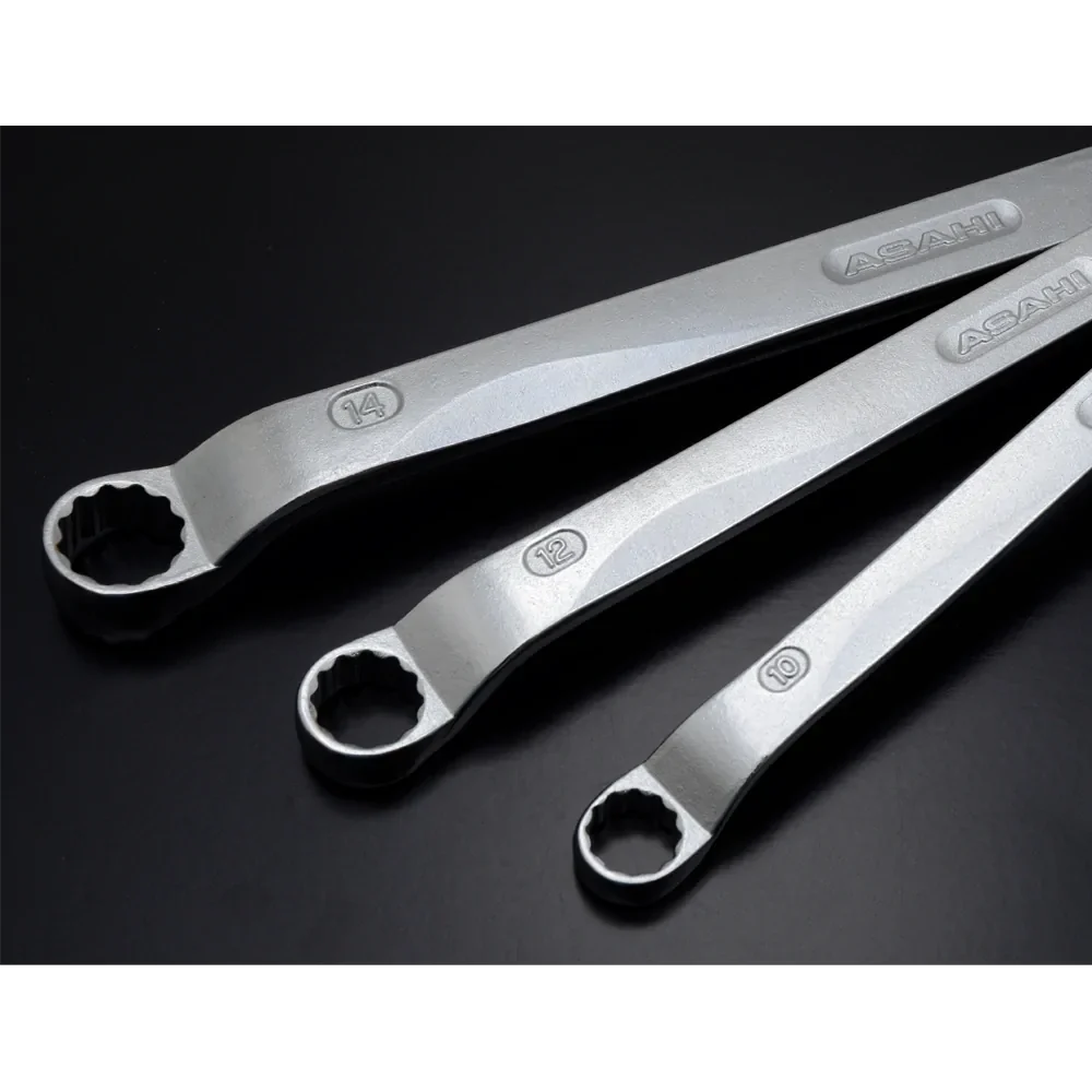 Die REVOWAVE-Ringschlüssel von ASAHI vereinen innovatives Design und höchste Funktionalität. Das matte Finish sorgt für einen hochwertigen Look, während der ergonomische Griff perfekt in der Hand liegt – ideal für präzises Arbeiten und komfortables Greifen.
